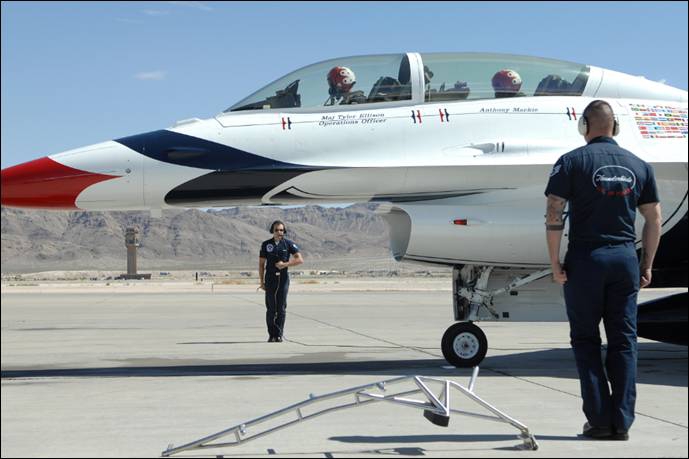 Thunderbird 7, Maj. Tyler Ellison and crews chiefs conduct final preflight checks before departing for a media flight with actor Anthony Mackie, March 31, 2014, at Nellis Air Force Base, NV. (U.S. Air Force Photo by Master Sgt. Stan Parker)