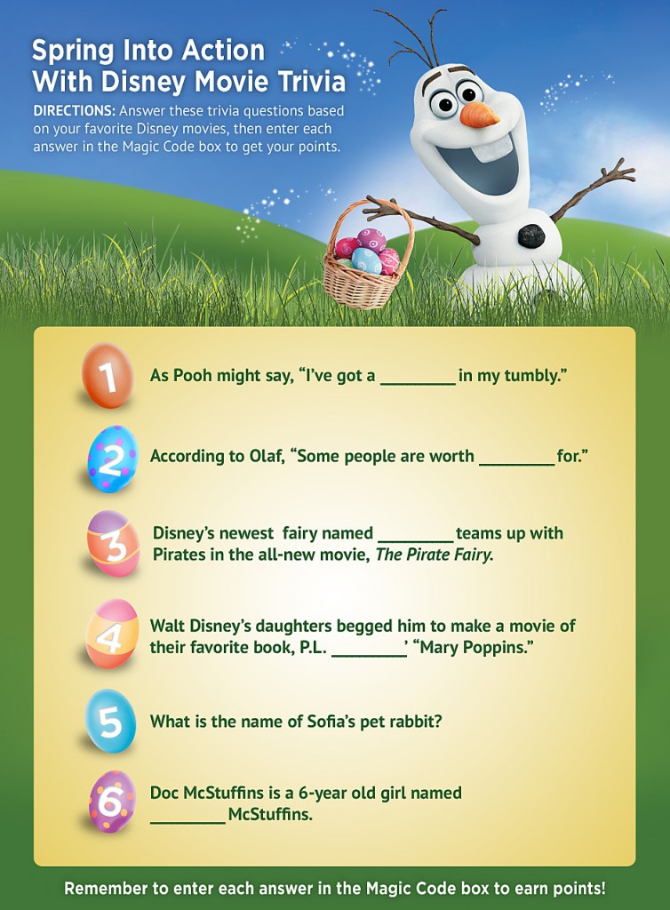 Disney Movie Rewards is hosting a Spring trivia contest where you can get up to 30 bonus points. Plug the answers into the magic code box to get your bonus points.