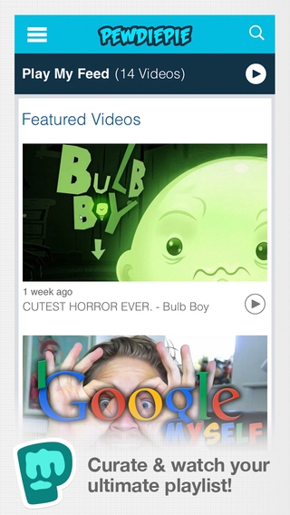 ‘How’s it going, bros. My name is PewDiePie.’ Now you can get the latest and greatest gameplay videos delivered directly to you everyday with the official PewDiePie app powered by Maker Studios. Fridays with PewDiePie, Best of, Collabs and of course PewDiePie’s Let’s Play video are now available wherever you go.Personalize Your Feed The most popular and most recent videos flow into your feed already. To add content just click the blue plus signs and those videos get added to your feed. If you love PewDiePie’s Montages just add and now the latest episodes are front and center in your feed.