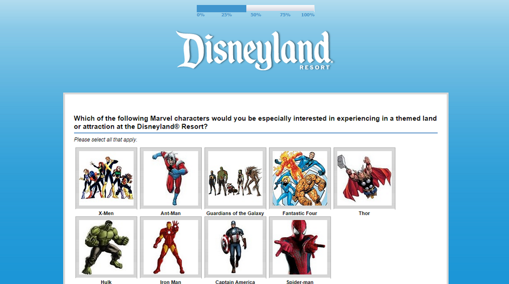 Recently, the Disneyland Resort sent out a survey asking what guests felt about the presence of Marvel at the Disneyland Resort. The survey asked about the current Marvel presence at the parks as well as what guests would like to see in the future. They asked about familiarity with the characters, which characters we would like to see in the future, as well as what we are excited about and concerned about regarding Marvel's presence in the parks.