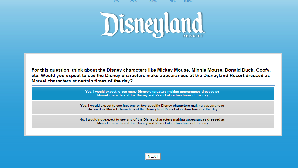 They also asked which park would you feel each character should be located in as well as feeling about Disney characters dressing up as Marvel characters (like the Disney characters dress as Star Wars characters during Star Wars Weekends). They also focused on asking if Marvel villains should be available for meet and greets as well.