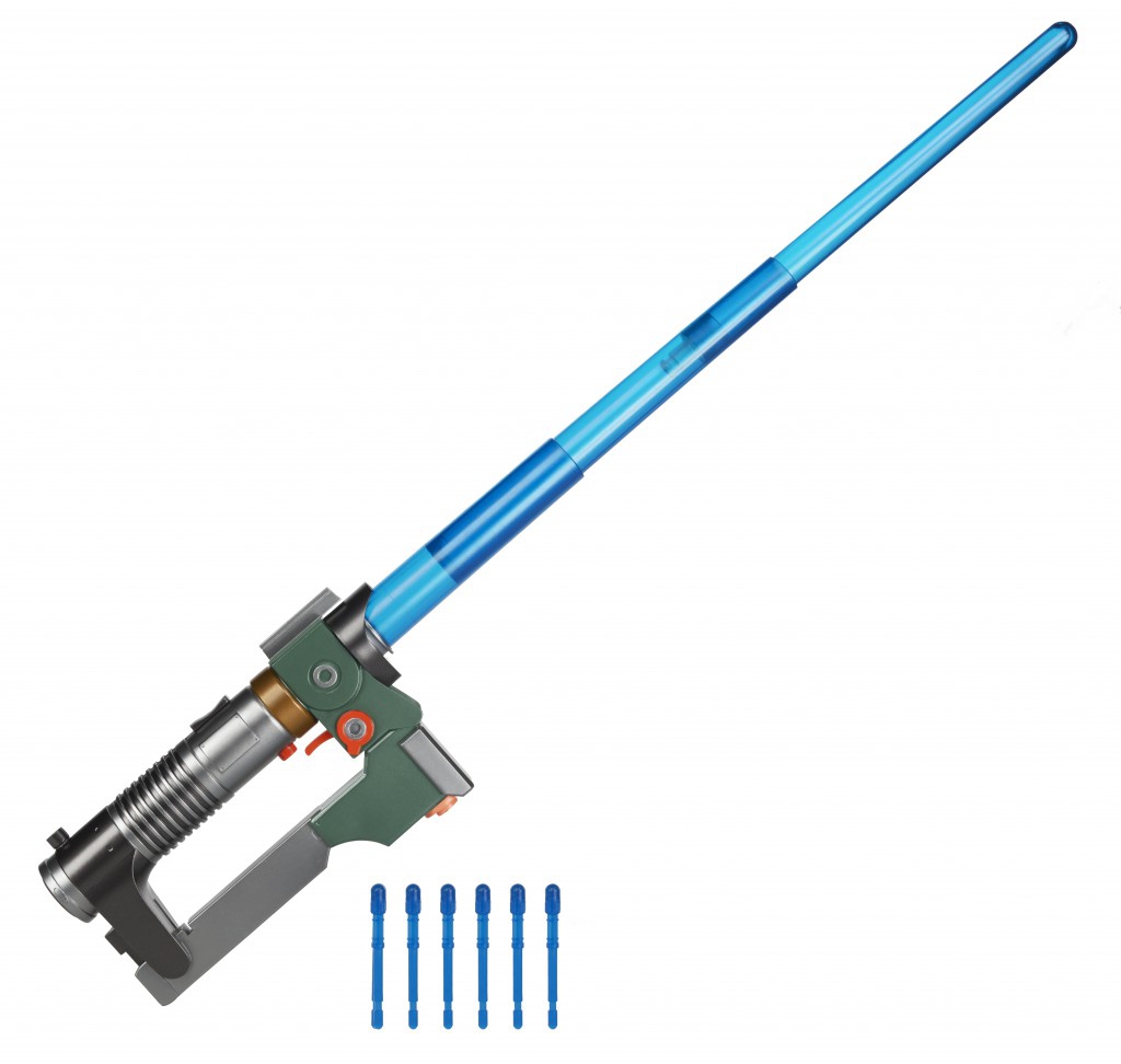 The signature weapon of the new JEDI hero from STAR WARS REBELS, the EZRA BRIDGER LIGHTSABER BLASTER is two fun role-play weapons in one! The LIGHTSABER features an 18-inch light-up extending blade and real LIGHTSABER sound effects. The built-in blaster fires two darts and features signature blaster sound effects. Includes six darts. Requires three AAA batteries — demo batteries included.