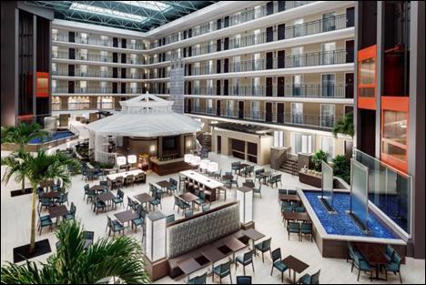 Embassy Suites Orlando-Lake Buena Vista Resort features a fully redesigned open atrium that offers sophisticated Bahamian-style decor with individual pod stations serving as the front desk, water features, a pavilion, separate lounge seating, and a new evening Manager’s Reception bar. There is also a new Starbucks® coffee bar and full atrium guest seating.