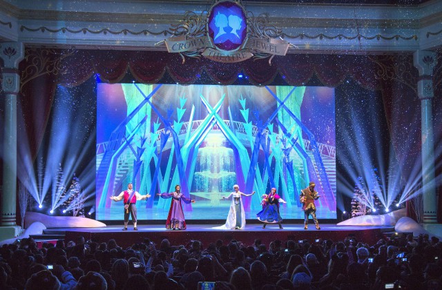 Another element of “Frozen Fun” is “For the First Time in Forever – A Frozen Sing-Along Celebration,” which transforms the Muppet*Vision 3D Theatre into the Crown Jewel Theatre of Arendelle. When Anna, Elsa and Kristoff take part in a comedic retelling of their story, musical sequences (and lyrics) are shown on the theatre’s large screen, and guests are invited to sing along.