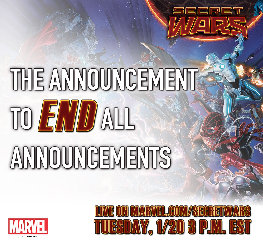 A unique collaboration with Midtown Comics, the SECRET WARS LIVE KICKOFF can be viewed on Marvel.com/secretwars at 3 p.m. EST on Tuesday, 1/20/2015. For more details, keep your eyes peeled to Marvel.com and join in the conversation on social media using the hashtag #SecretWars.