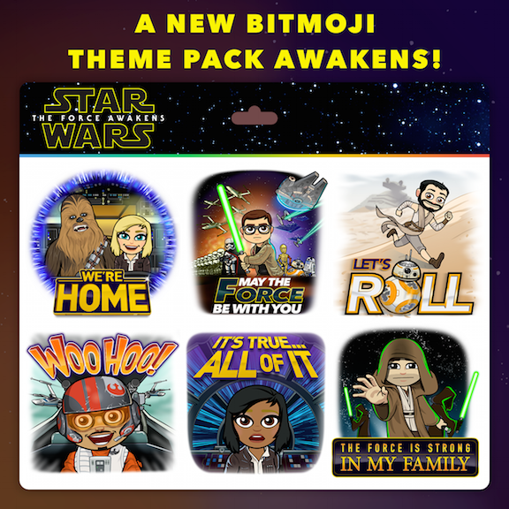 Star Wars: The Force Awakens has teamed up with Bitmoji to create a new free theme pack. This collaboration immerses your Bitmoji avatar in the Star Wars universe.  Each hand-drawn Star Wars bitmoji features your avatar in a setting inspired by the new movie, dressed in a custom outfit and saying a phrase that can easily be shared in everyday messaging conversations.