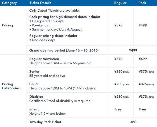 Shanghai Disneyland will also be the first Disney resort to utilize demand pricing (also known as dynamic pricing). The regular price of a single day ticket will be 370 RMB (56 USD) while holidays, weekends, and other peak times will raise to the 499 RMB level. Discounts will also be available: