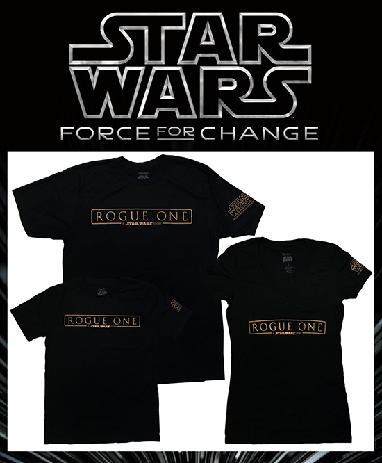 Today the Disney Parks Blog announced that, starting on Star Wars Day (May 4th), Disneyland and Walt Disney World will begin selling exclusive shirts to benefit the Star Wars: Force for Change. The set of shirts will feature the logo of the upcoming Rogue One film hitting theatres this December.
