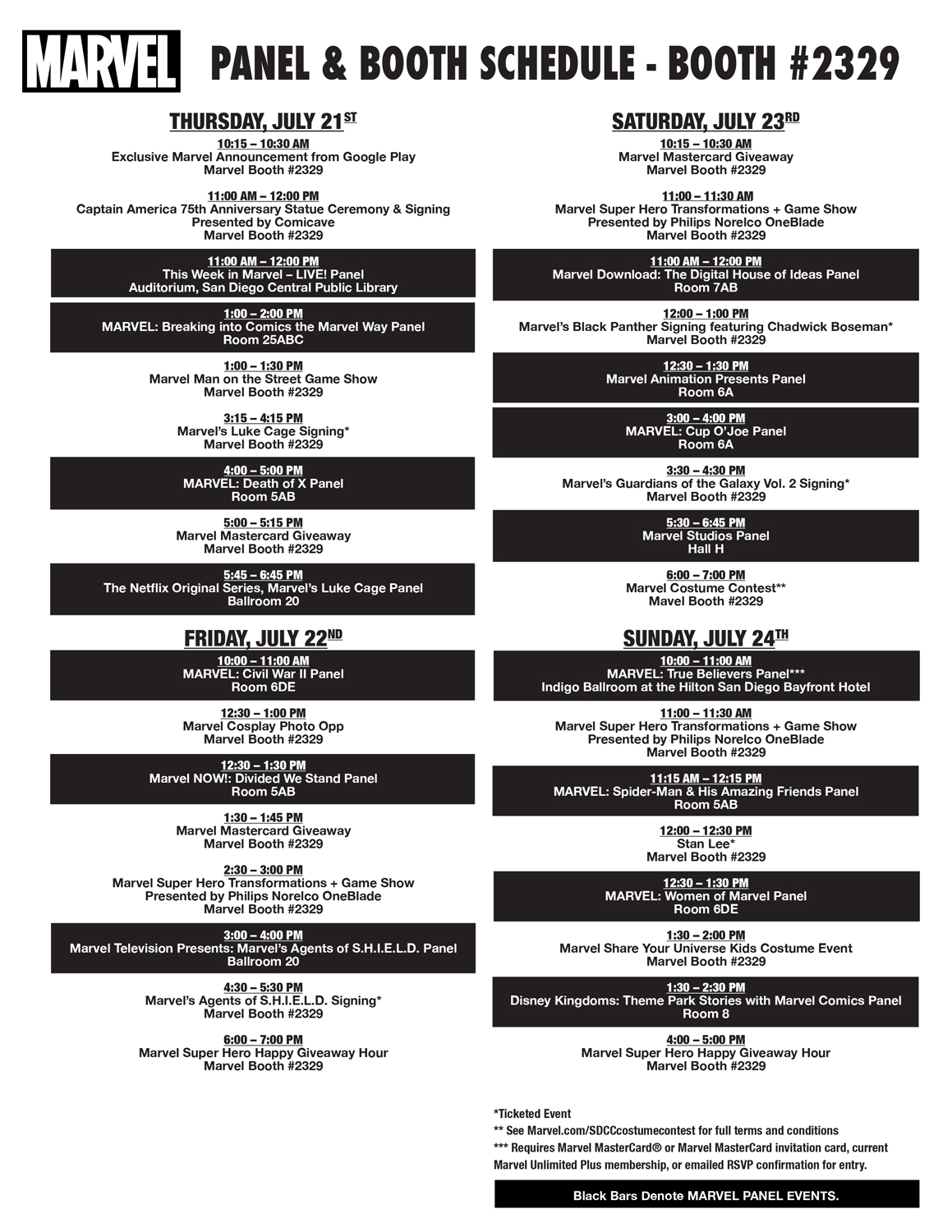 [gallery td_select_gallery_slide="slide" ids="151967,151966"]Can’t make it to the convention? Follow along on Marvel.com/SDCC2016 and @Marvel on Twitter, the best way to get real-time announcements from the convention floor and up-to-the-minute panel, in-booth, and signing schedules of all your favorite Marvel creators!