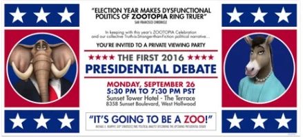 Clearly there is box office business to be had by jumping into the political debate, and now many think it can benefit a film’s awards prospects as well. So it shouldn’t be too surprising that there is one movie trying to tie itself directly into tonight’s debate (Deadline will be live-blogging the Clinton-Trump faceoff). But who knew it would come from Disney? The studio’s animated smash Zootopia is throwing a debate-watching party tonight at the Sunset Tower. The filmmakers won’t be on hand campaigning, I’m told, but Disney has invited members of different awards groups including the Broadcast Film Critics Association and the Hollywood Foreign Press Assocaition to join in the festivities. The invite — which features a donkey character from the film dressed up as Clinton (repping the Democrats) and an elephant dressed as Trump (repping the GOP) — quotes political strategist Mike Murphy predicting of the debate that “It’s going to be a zoo!”