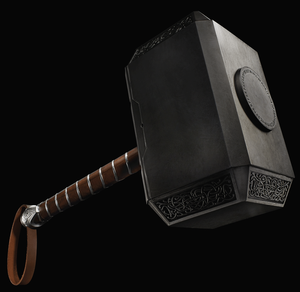 Summon the power of Thor with this premium, theatrical-inspired Mjolnir! This 1:1 full scale movie-inspired hammer features premium design and styling, as well as intricate detailing on the pommel, strap, and hammerhead. Those who are worthy may wield this mighty Mjolnir with electronic thunder, lightning and light up rune effects. Requires 3 AA batteries, not included. Available at most major retailers and on HasbroToyShop.com.