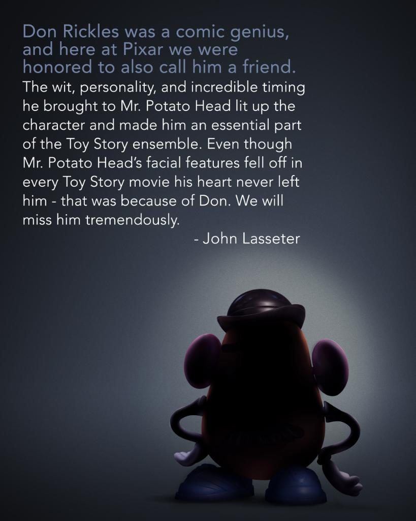 "Don Rickles was a comic genius, and here at Pixar we were honored to also call him a friend. The wit, personality, and incredible timing he brought to Mr. Potato Head lit up the character and made him an essential part of the Toy Story ensemble. Even though Mr. Potato Head's facial features fell off in every Toy Story movie, his heart never left him - that was because of Don. We will miss him tremendously. -John Lasseter
