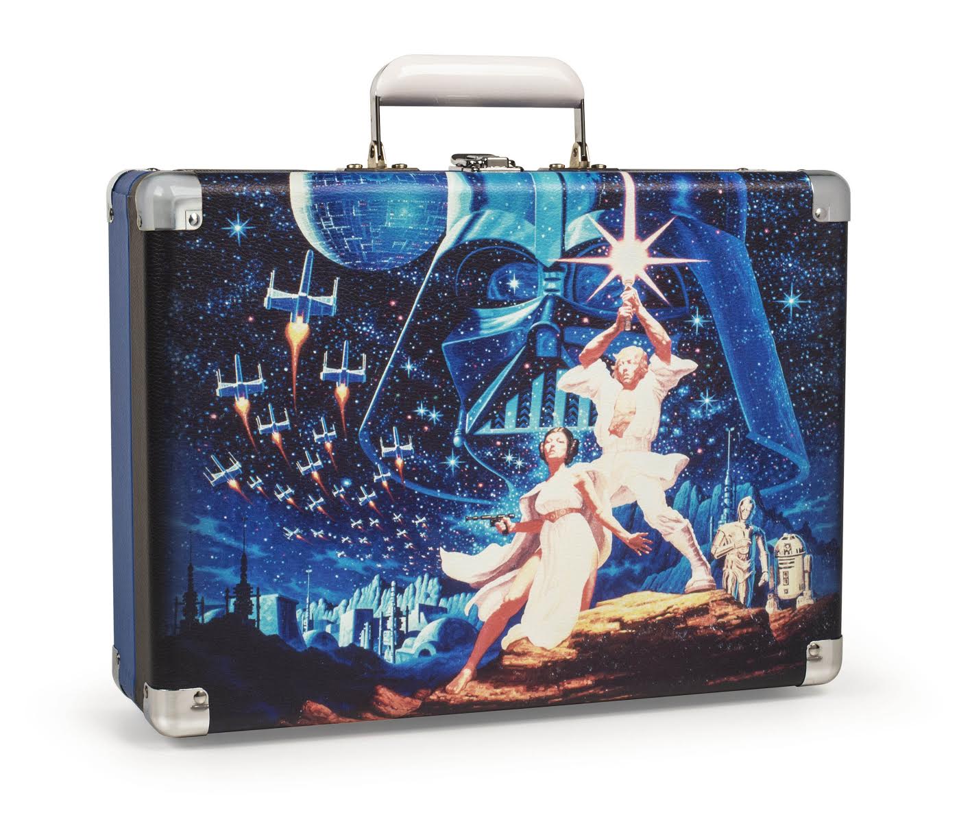 Star Wars imagery will appear on the outside and inside of the special edition Crosley Cruiser Deluxe, a portable three-speed turntable that retails for $109.95, featuring pitch control and bluetooth capability. Designed to reflect the stylings of yesteryear, the Cruiser includes modern conveniences like dynamic full-range stereo speakers, a headphone jack and RCA outputs. Imagery celebrates the 40th anniversary of Star Wars: A New Hope, and is based off of iconic poster art from the original release in May 1977. This is the fourth year that Crosley has released an exclusive Record Store Day turntable.