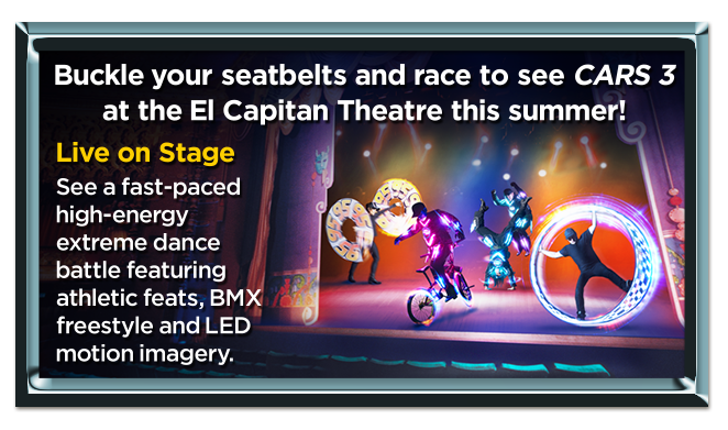 El Capitan Theatre General Manager Ed Collins said, “The El Capitan Theatre is the place to be for Disney/Pixar’s Cars 3. At The El Capitan Theatre, guests will begin their CARS 3 adventure by experiencing an all-new Stage Show live on the El Capitan stage. It’s a fast-paced high-energy dance battle featuring athletic feats, BMX freestyle, and LED motion imagery.