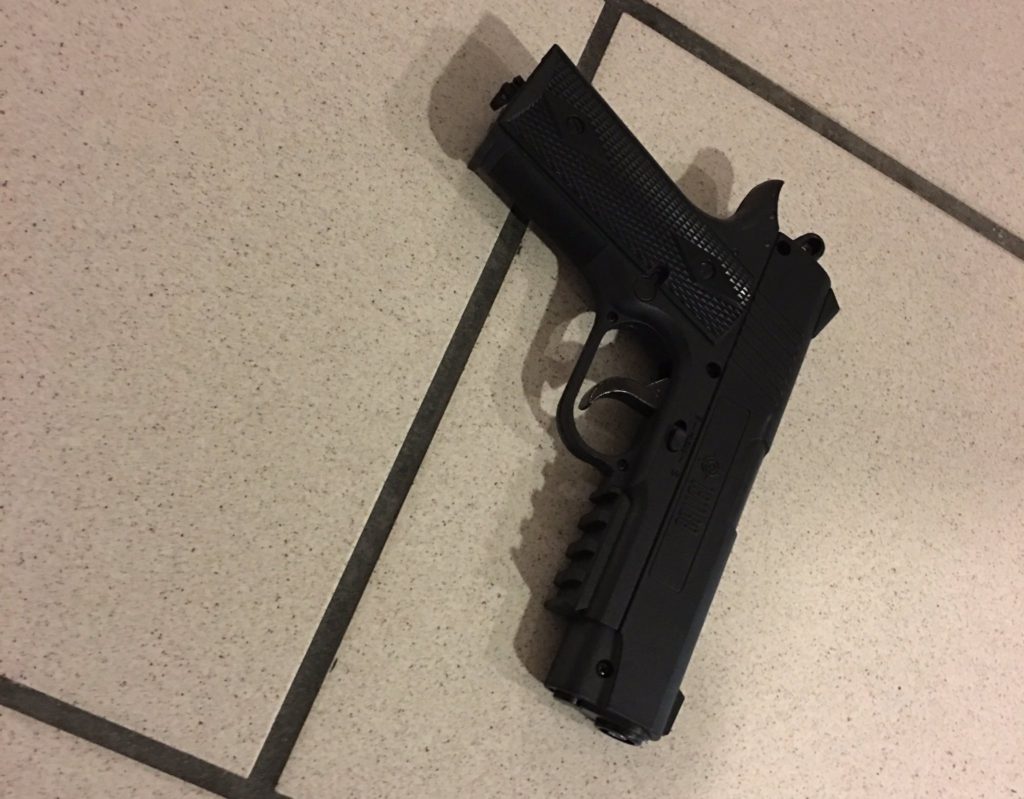UPDATE 10:56 ET: As it turns out, the weapon held by the subject was a simulated weapon. It was not a gun. The suspect asked the officers to shoot him and was obviously in mental distress. This is an image of the fake gun: