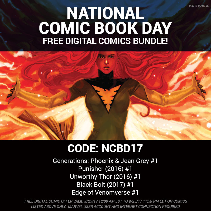 To celebrate National Comic Book Day, Marvel is giving away a free bundle of digital comics. The bundle includes Generations: Phoenix & Jean Grey #1, The Punisher #1, Unworthy Thor #1, Black Bolt #1, and Edge of Venomverse #1. To pick up your comics visit Marvel.com/redeem and enter the code NCBD17. The offer expires at 11:59 EDT on September 25, 2017 so act fast.