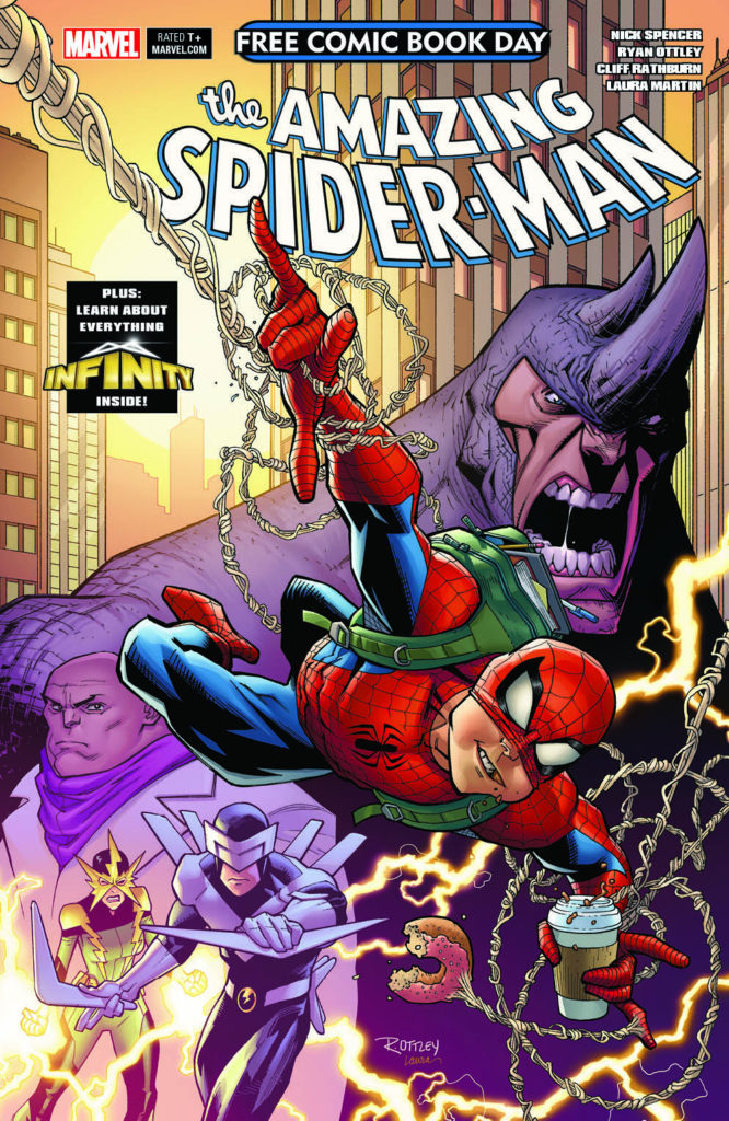 Fans will be able to read the first Amazing Spider-Man story from Nick Spencer and Ryan Ottley in the Amazing Spider-Man/Guardians of the Galaxy Free Comic Book Day issue, on sale May 5th – and can view the cover for the FCBD issue by Ryan Ottley for the first time below.