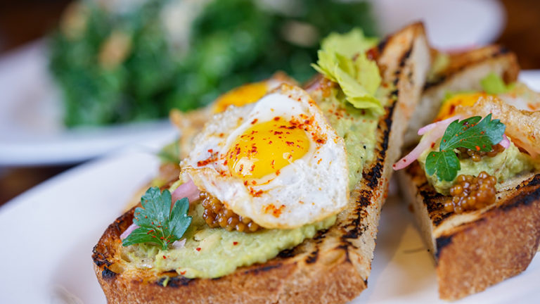 Avocado Toast—Crushed avocado, lemon-olive oil, parsley, celery leaves, quail eggs, and Espellete pepper on slice of grilled sourdough