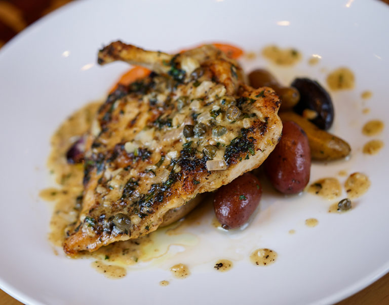 Chicken Paillard— Lightly-breaded chicken breast with roasted potatoes and heirloom carrots, topped with a lemon-caper sauce.