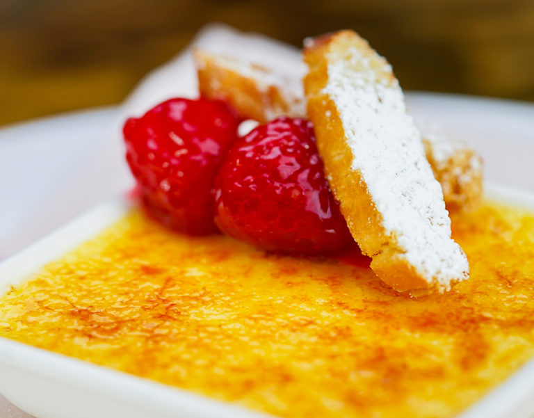 Vanilla Crème Brûlée—Crème Brûlée with orange-vanilla biscotti and marinated raspberries.