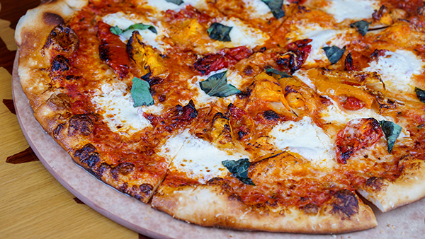 Margherita Pizza—Fresh mozzarella and basil, Grana Padano, fire-roasted tomatoes, and aged provolone cheese.