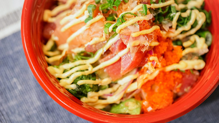 Build-Your-Own Poke Bowl—Create the perfect meal with choice of base, protein and sauce topped with avocado, cucumber, and red and green onions, and garnished with seaweed wakame, tobiko caviar, fried onions, pickled ginger, bonito flakes, and sesame seeds.