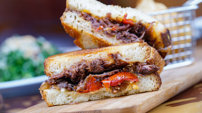 Short Rib Grilled Cheese—Grilled sourdough bread with cheddar cheese and caramelized onions.