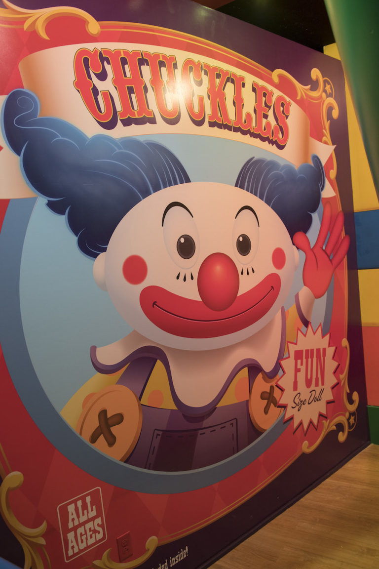 Chuckles the Clown from Toy Story 3 has his own wall as well including the words "Fun Size Doll" and "All Ages."