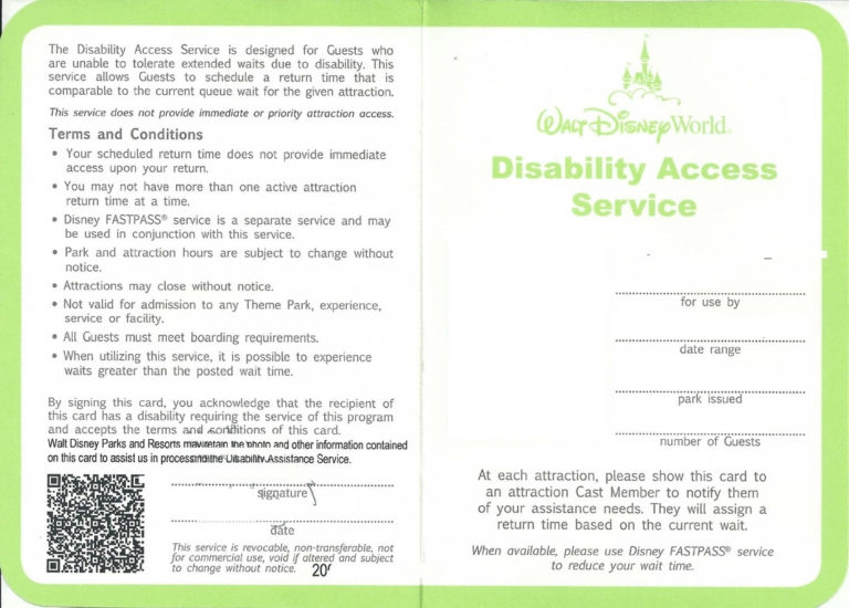 - Guests with disabilities visiting Disney Parks can get a special card — a Disability Access Service card — that allows them to make "appointment times" at attractions with wait times longer than 15 minutes. They are able to make unlimited appointments throughout the day.