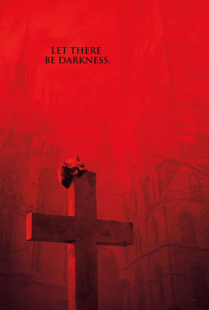 - The new poster features the Daredevil mask resting on a cross in front of a church with the tagline "Let There Be Darkness."