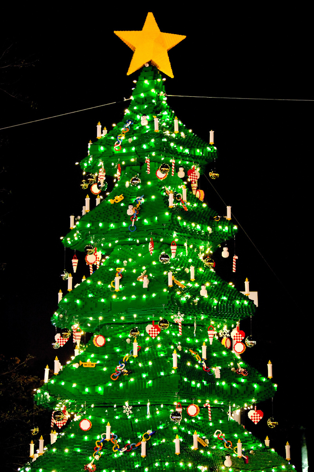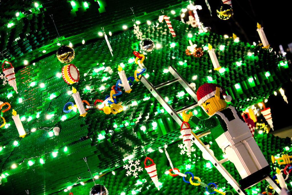 - Synchronized light shows on a 30-foot-tall LEGO Christmas tree put on a dazzling display as “snow” flurries fall