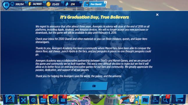 - “Thanks to you, ‘Avengers Academy’ has been a community where Marvel fans have been able to conquer the dance floor, eat cheese, punch Hydra in the face, and put penguins in places no one thought penguins could go. ‘Avengers Academy’ was a collaborative partnership between TinyCo and Marvel Games, and we are proud of the game and community we’ve built together.”