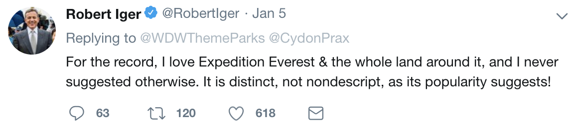 - This apparent departure and return comes after a series of Twitter-related stories surrounding Iger, including him responding to a fan regarding what was perceived as a slight against Expedition Everest in a Barron’s interview.