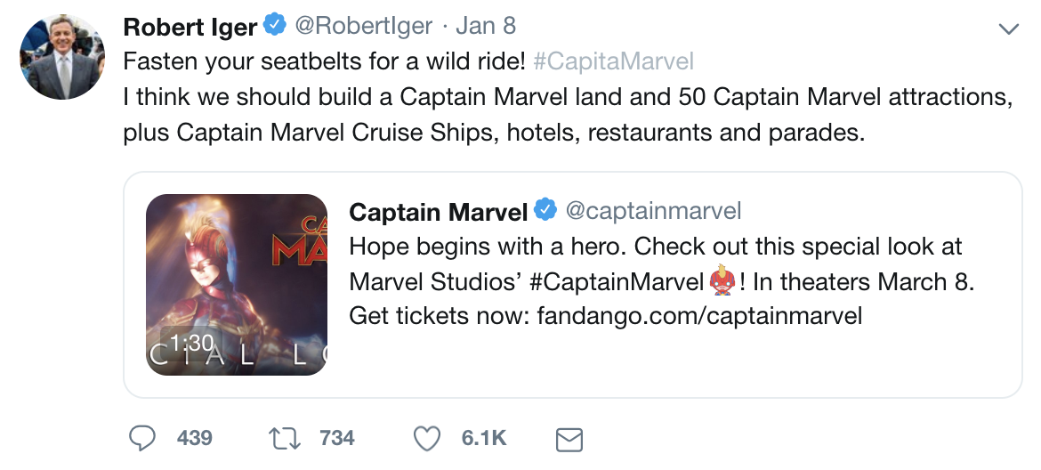 - More recently, fans were left puzzled when Iger’s account tweeted about Captain Marvel, saying “I think we should build a Captain Marvel land and 50 Captain Marvel attractions, plus Captain Marvel Cruise Ships, hotels, restaurants and parades.”