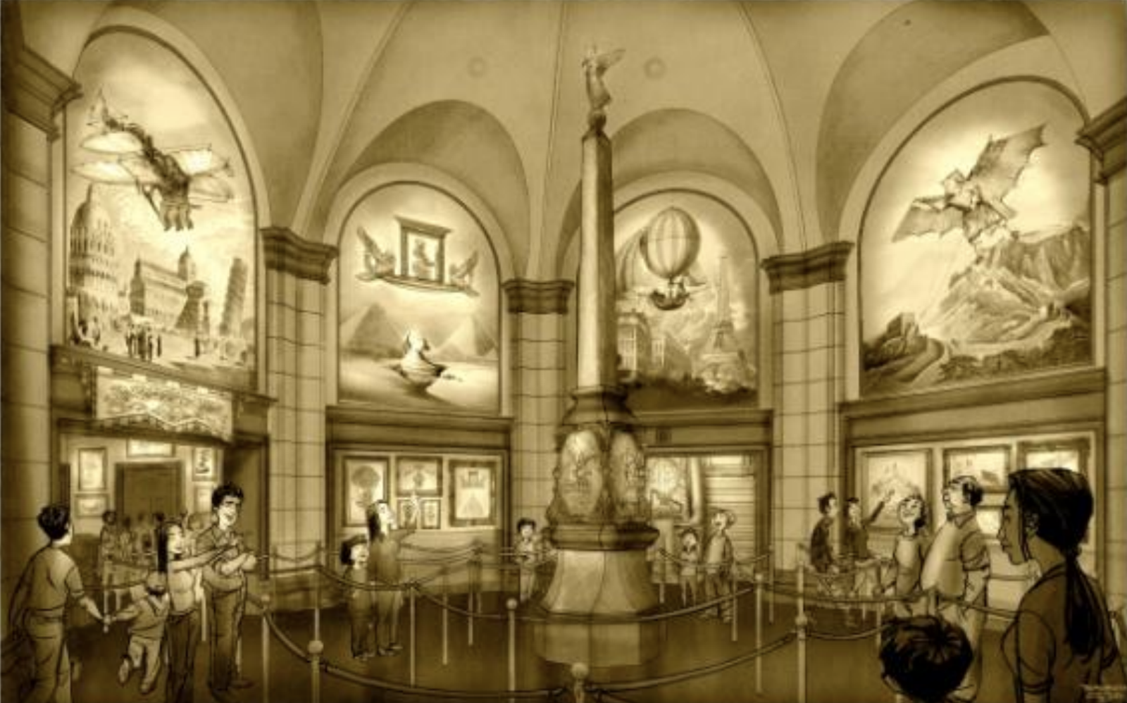 “Nestled in the hills of Mediterranean Harbor, amidst the backdrop of an old-world Italian village, the Museum of Fantastic Flight is dedicated to humankind’s enduring dream of flying. Today, the museum celebrates Camellia Falco—a visionary innovator in the fledgling field of aviation—with a special retrospective of her life. A grand tour of the museum includes a magical visit from the spirit of Camellia and culminates with Guests boarding her latest and greatest achievement—a flying vehicle of her own design called the Dream Flyer. Guests soon experience what Camellia believed, that our imagination can propel us into the future and take us everywhere in the world we wish to go. And before Guests know it, their spirits are sent soaring.”