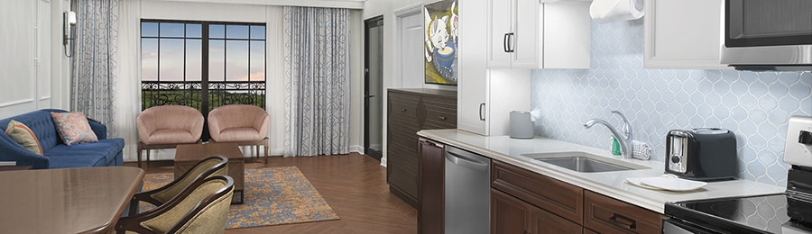 - One-bedroom, two-bedroom and grand villas will feature large, fully equipped kitchens with dining space open to a living area.