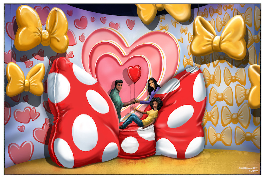- In this area, guests can pop into the portrait and take a seat on Minnie’s plush sofa or pose under Minnie’s giant bows and hearts.
