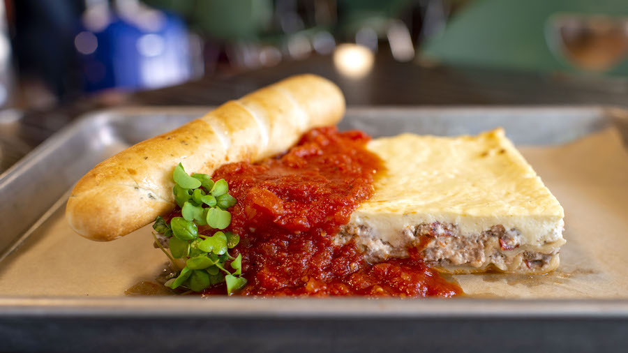 Lasagna-Pasticcio – Baked layers of stracciatella, Bolognese sauce, pasta, and Béchamel sauce topped with a house-made Pomodoro sauce and served with a fresh breadstick.