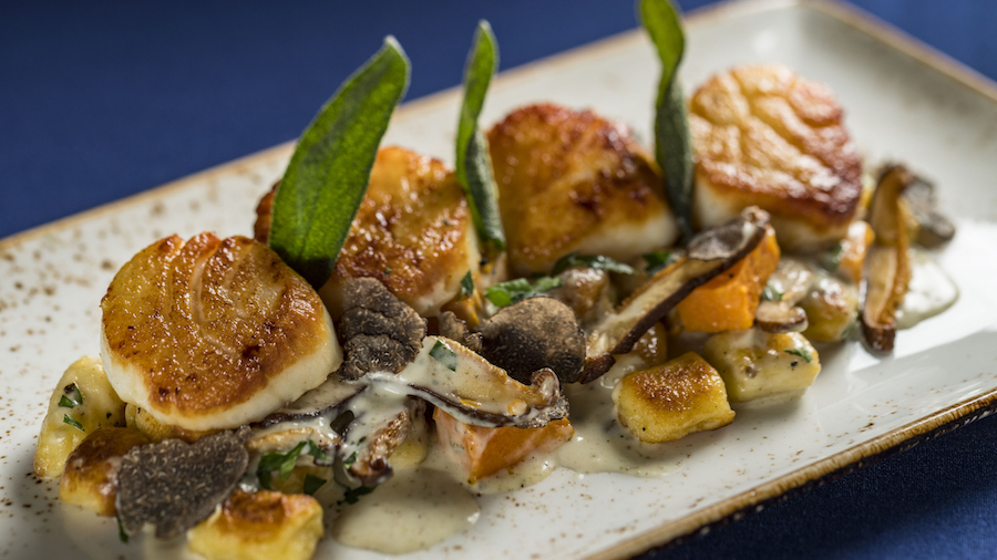 Pan-seared Georges Bank Day Boat Scallops – House-made Parisian gnocchi, shiitake mushrooms, fall pumpkin, brown butter-truffle cream sauce, shaved black truffles, and fried sage.