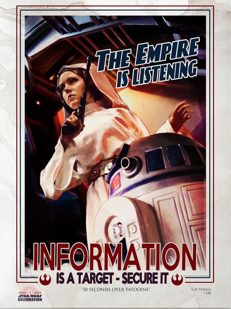 - “Continuing the fan-favorite propaganda series, I chose to do a ‘Loose Lips’ theme this time featuring Princess Leia and R2-D2. Information security is a big part of the success of the rebellion, and this scene is an iconic moment from the saga, the moment Leia sets the fall of the Empire in motion.”