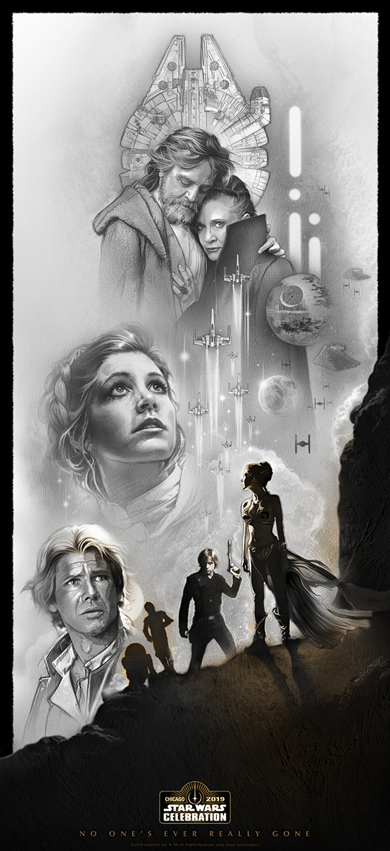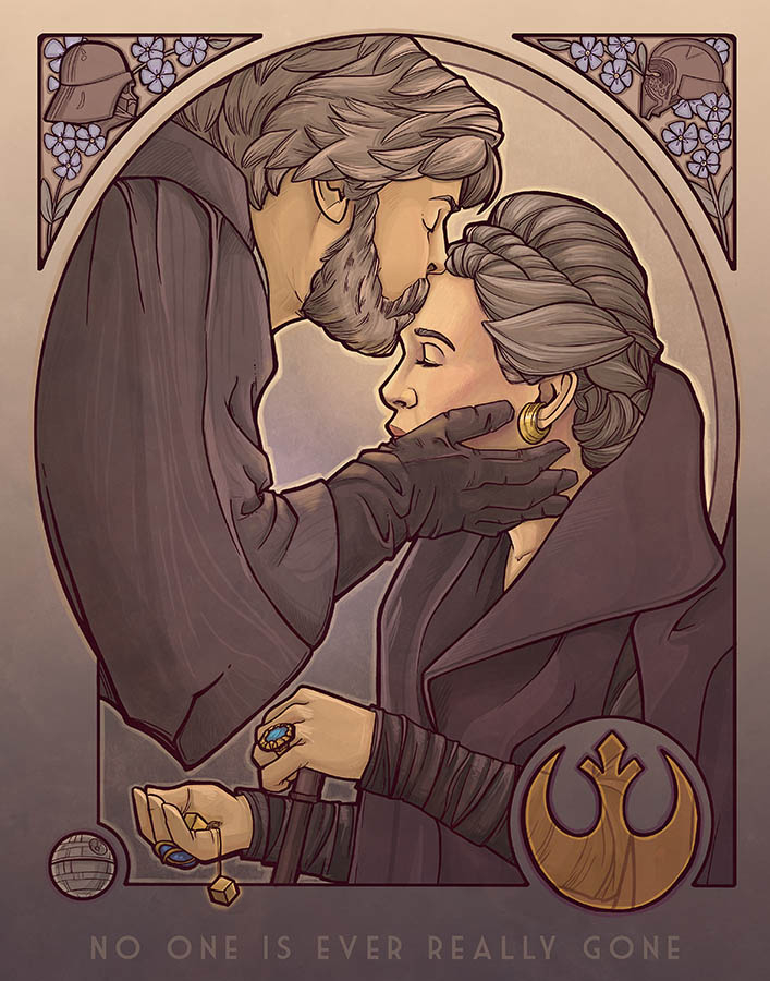 - “I was heartbroken when Carrie Fisher passed away, so my illustration not only captures a beautiful moment in the movie between two characters I adore, but it’s also a tribute to Carrie herself. As a lifelong Star Wars fan, this scene was one of my all-time favorites. Princess Leia has been an inspiration for a very long time because growing up, there were not a lot of strong female characters like Leia. Now, as an adult, getting to see her story all the way through and see her become a General is just incredible.”