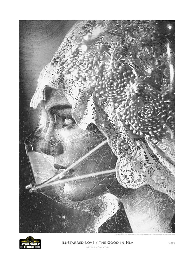 - “Star Wars has so many strong motifs and archetypes, I always find inspiration in them. The idea of this image came into my mind when I was standing in a beautiful garden at Lake Como last September, at the shooting location of the wedding scene from Attack of the Clones. The picture catches the dark and inevitable future in a beautiful and happy moment: Darth Vader’s mask building up like a cracked glass coffin around Padmé’s face. From the opposite point of view, if we try to see through Vader’s mask, we can see the love and the good in him — the good that never left him.”