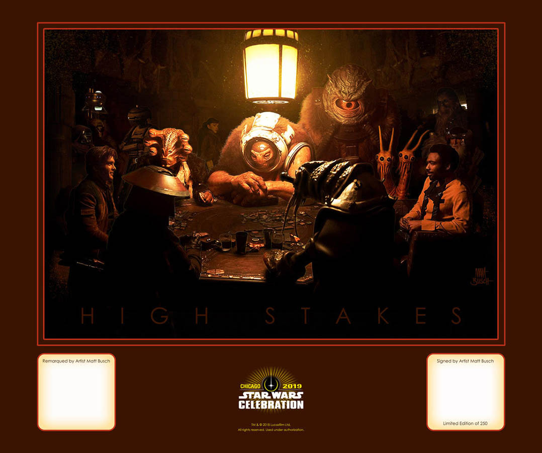 - “It’s a case of life imitating art, and then art imitating life once again. In the film Solo: A Star Wars Story, the lighting and staging of the scene where Han Solo and Lando Calrissian play an intense game of sabacc was inspired by classic Caravaggio paintings. Here, I’ve reversed the inspiration by depicting the scene using the same chiaroscuro light and shadow to create a new stylized Baroque work of art. I wanted to create a piece that would be perfect to frame and hang anywhere you play cards.”