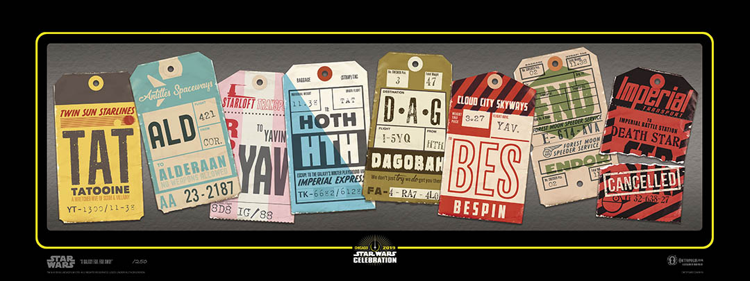- “My inspiration came from vintage railway and airline luggage tags. I began by dreaming up a few Star Wars-themed luggage tags for passengers visiting planets like Endor or Hoth. That’s when I had the idea to illustrate the story of the original trilogy with Star Wars luggage tags, starting with Tatooine and ending with a tag for the Death Star that is ripped in half to symbolize its destruction.”