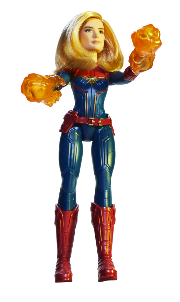 This 11.5-inch scale, electronic Photon Power FX Captain Marvel Electronic Doll, features superpower-inspired lights, sounds, accessories, and rooted hair. The doll is inspired by the upcoming Captain Marvel movie, is poseable, and features 11 points of articulation allowing kids to put their doll in dynamic poses and move her into action! Includes doll, belt, boots, and instructions. Each sold separately. Requires 1 AAA battery, included. Available at most major retailers.