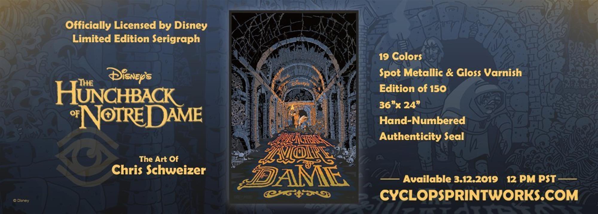 Cyclops Print Works is proud to reveal new artwork inspired by the Hunchback of Notre Dame. Designed by artist Chris Schweizer, this unique serigraph features Quasimodo and Phoebus.