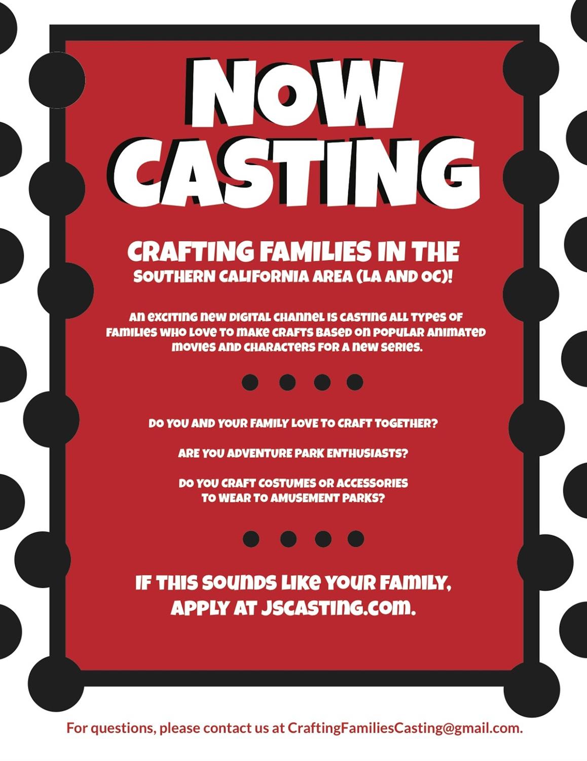 Now casting crafting families in the Southern California area (LA and OC). An exciting new digital channel is casting all types of families who love to make crafts based on popular animated movies and characters for a new series.