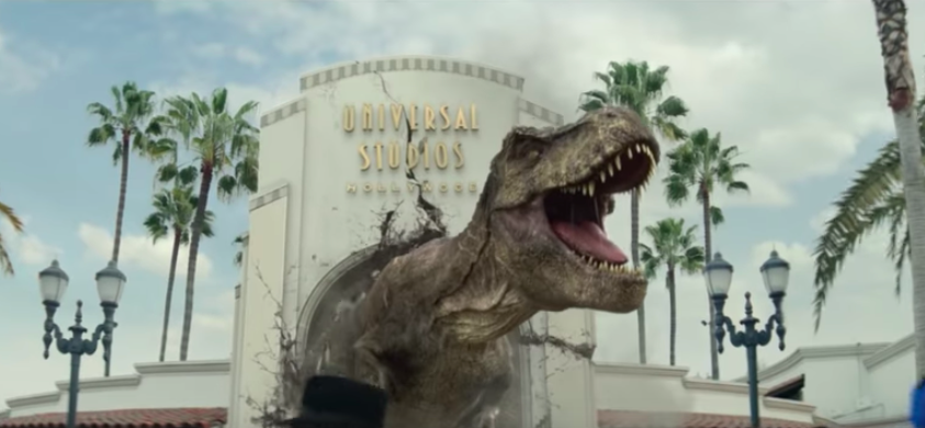 - The massive dinosaur crashes through the iconic gates of Universal Studios Hollywood before letting out its memorable roar in the new ad.