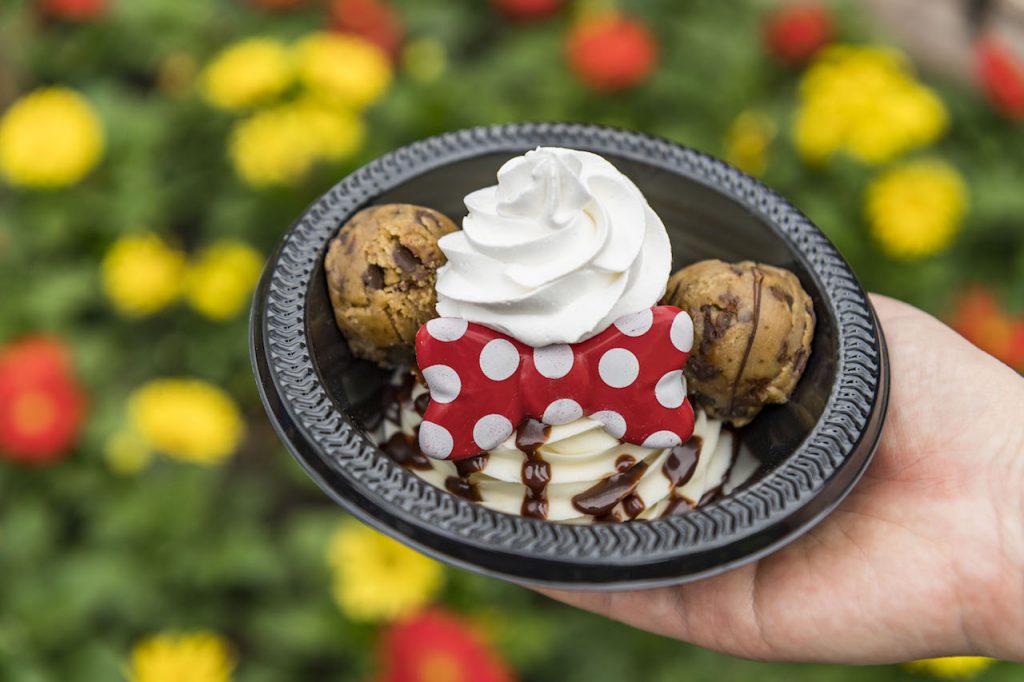 - Back in Fantasyland, Storybook Treats will offer Minnie’s Cookie Dough Sundae, consisting of soft-serve ice cream topped with whipped cream, hot fudge, edible cookie dough, and a chocolate Minnie bow.