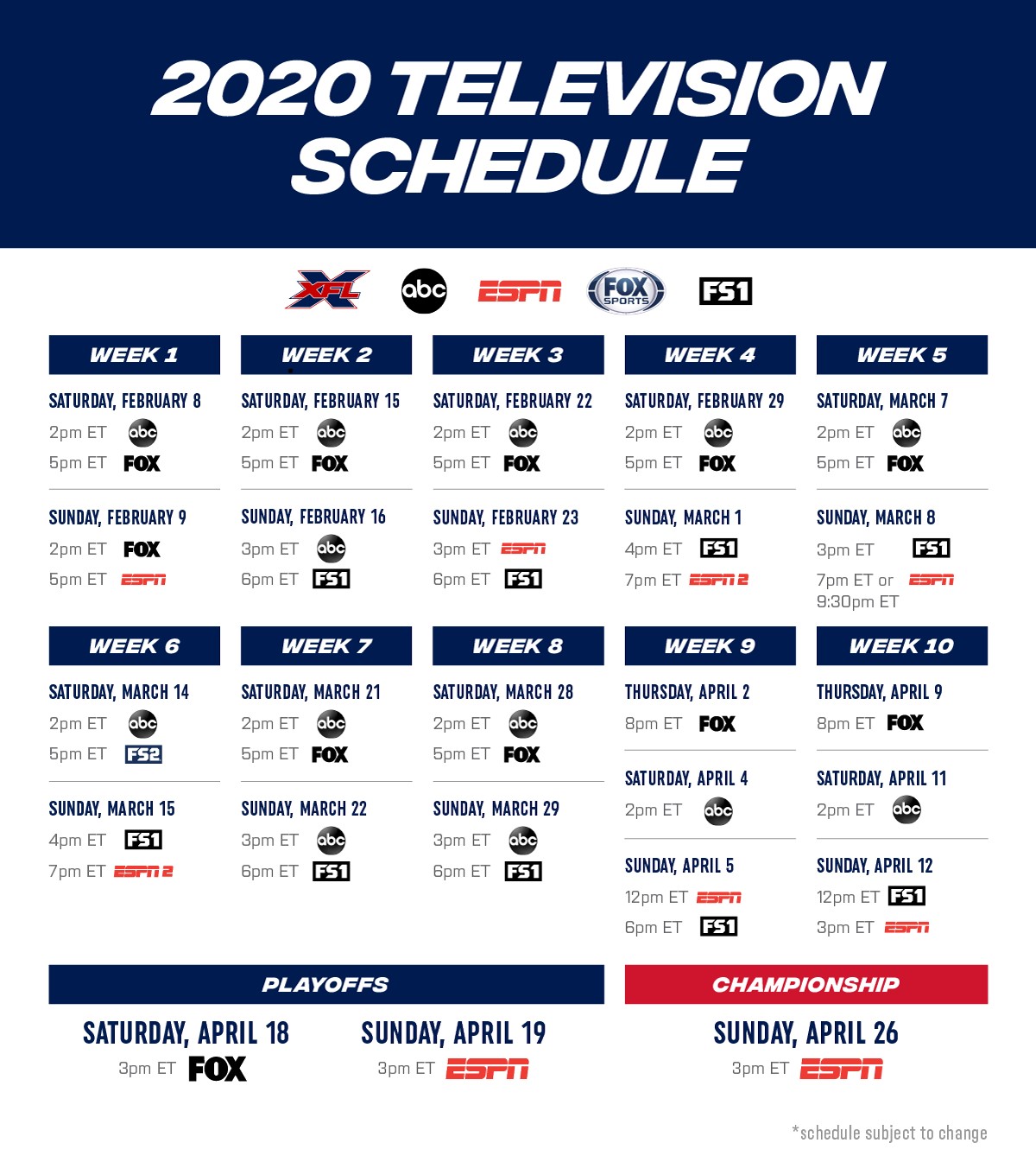 - The XFL TV schedule allows for consistent appointment viewing each week with back-to-back games starting Saturday afternoons at 2 pm ET as well as two additional games on Sunday afternoons.